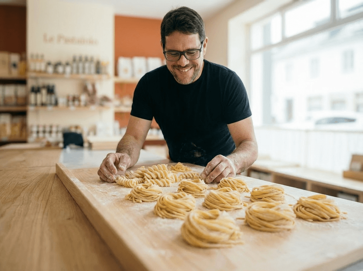 Situé au cœur de Chamonix Mont-Blanc, Le Pastaïolo est votre atelier de pâtes fraîches et épicerie italienne dédiée au vrai goût d’Italie. Chaque jour, nous façonnons à la main des pâtes fraîches artisanales, à emporter ou à cuisiner chez vous, accompagnées de sauces italiennes, d’huiles d’olive, de charcuteries et de produits d’exception soigneusement sélectionnés. Que vous cherchiez un traiteur italien à Chamonix pour un repas entre amis, un dîner en amoureux ou un plat réconfortant après le ski, Le Pastaïolo vous apporte la dolce vita dans l’assiette.